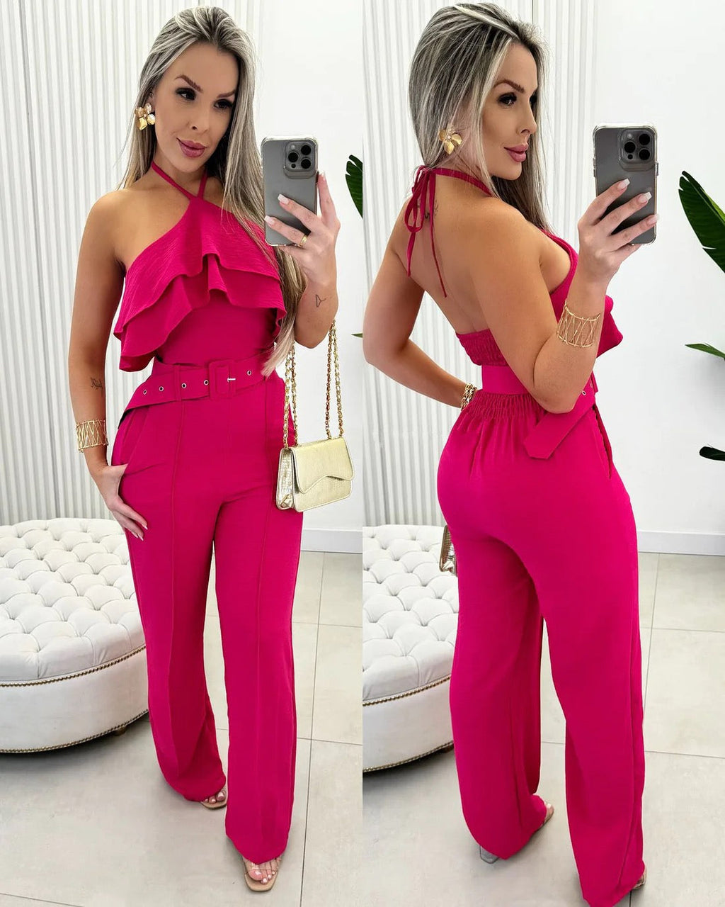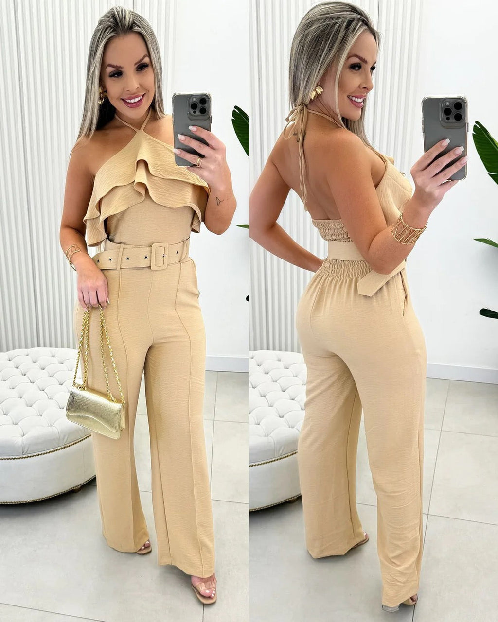 Este macacão é a definição de sofisticação e conforto, perfeito para diversas graças. Com detalhes delicados de babados, modelo de amarrar no pescoço e bolsos funcionais, você estará sempre na moda com estes macacões incríveis. O cinto oferece acréscimos ao seu visual, enquanto o modelo de lastex nas costas garante um ajuste perfeito. Sinta-se deslumbrante com o comprimento da calça e o forro suave que proporciona máximo conforto. Feito com tecido duna de alta qualidade, este macacão é uma peça essencial em seu guarda-roupa.